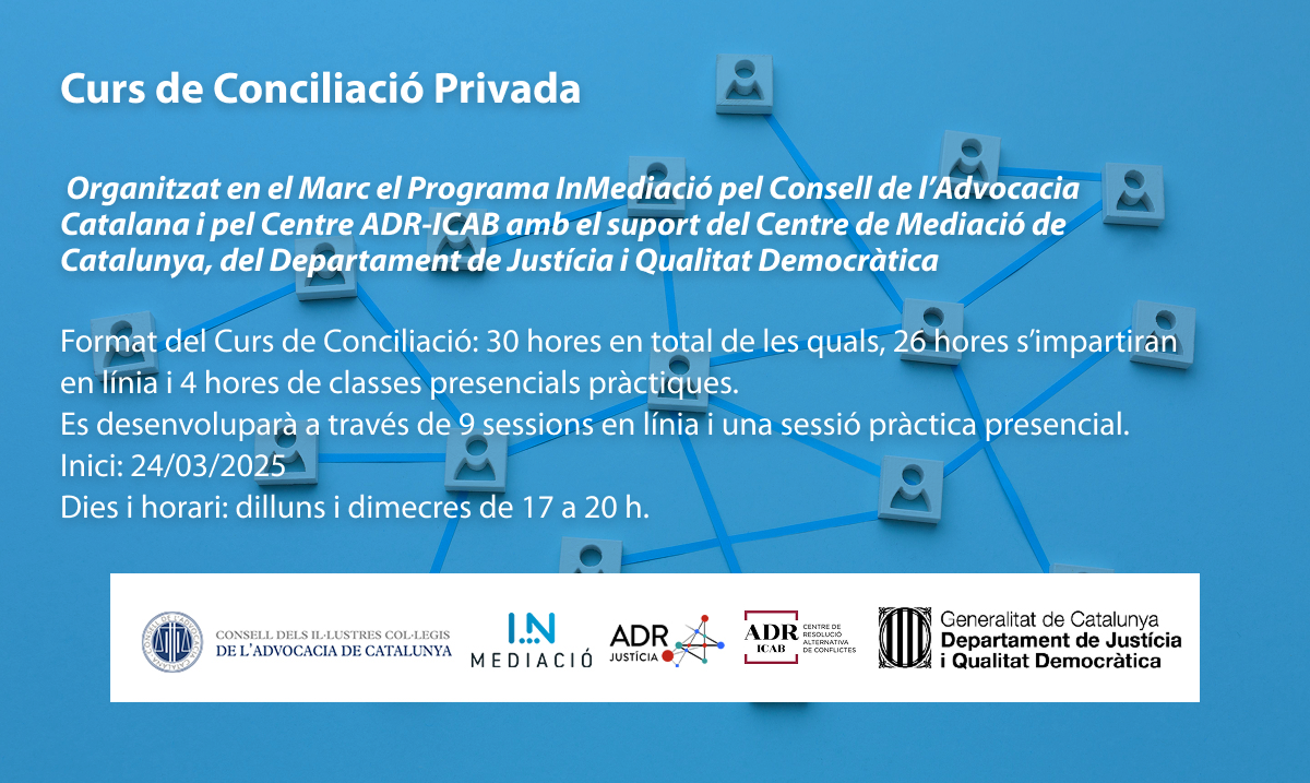 El dia 17 de juny de 2024 a partir de les 16 hores tindrà lloc el Webinar inaugural del Programa In-Mediació 2024, organitzat pel Consell de l’Advocacia Catalana, amb el suport del Centre de Mediació de Catalunya del Departament de Justícia, Drets i Memòria, de la Generalitat.